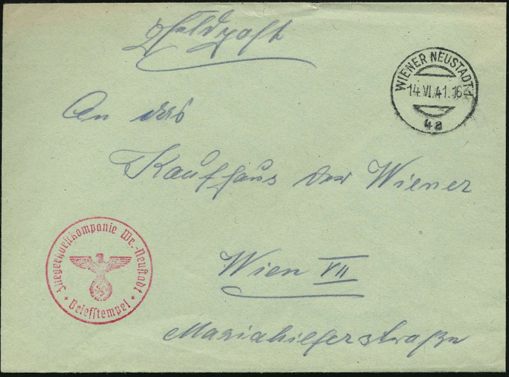 2960 | 15 € | II. WELTKRIEG: LUFTWAFFEN-EINHEITEN / LUFTFELDPOST 1939-45 : WIENER NEUSTADT 1/ 4a 1942 (14.6.) ehem. österr. 1K-Brücke + roter 1K-HdN: Fliegerhorstkompanie Wr.-Neustadt + vs. hs. Abs., klar gest. Feldpost-Bf. n. Wien | ![]() | |