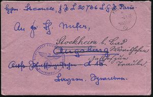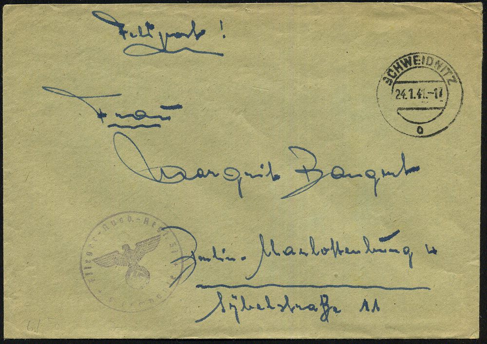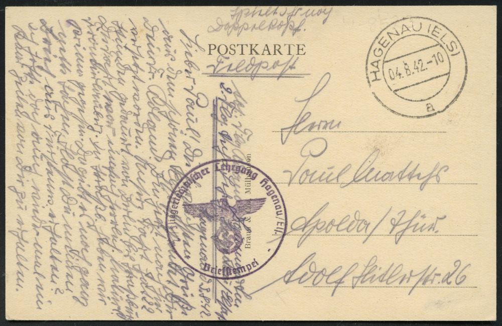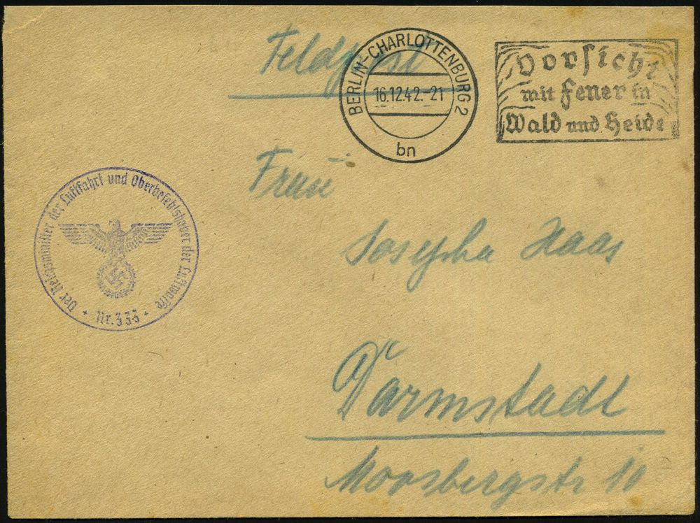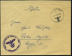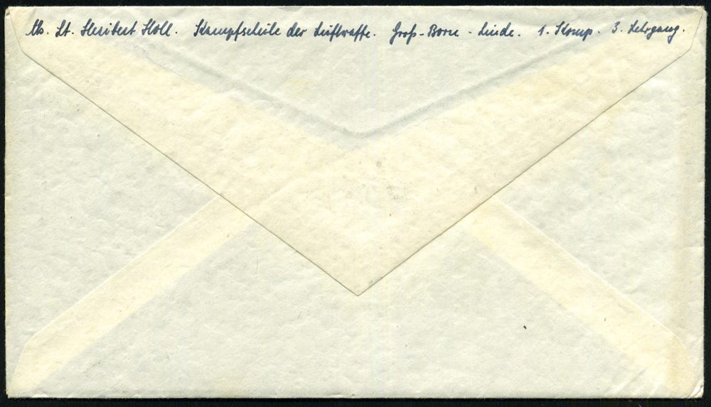 2935 | 30 € | II. WELTKRIEG: LUFTWAFFEN-EINHEITEN / LUFTFELDPOST 1939-45 : Lager Lechfeld 1942 (2.12.) stummer Band-MaSt. = Tarnstempel Augsburg (7 Striche) + viol. 1K-HdN: Fp. Nr. L 36 955 = Fall-schirm-Jäger Rgt. 2 + hs. Abs.: "Nachtjagdschule 1 Lagerlechfeld..", Feldpost-Bf. (oben 2x Riß) + viel Inhalt! n. Berlin | ![]() | |