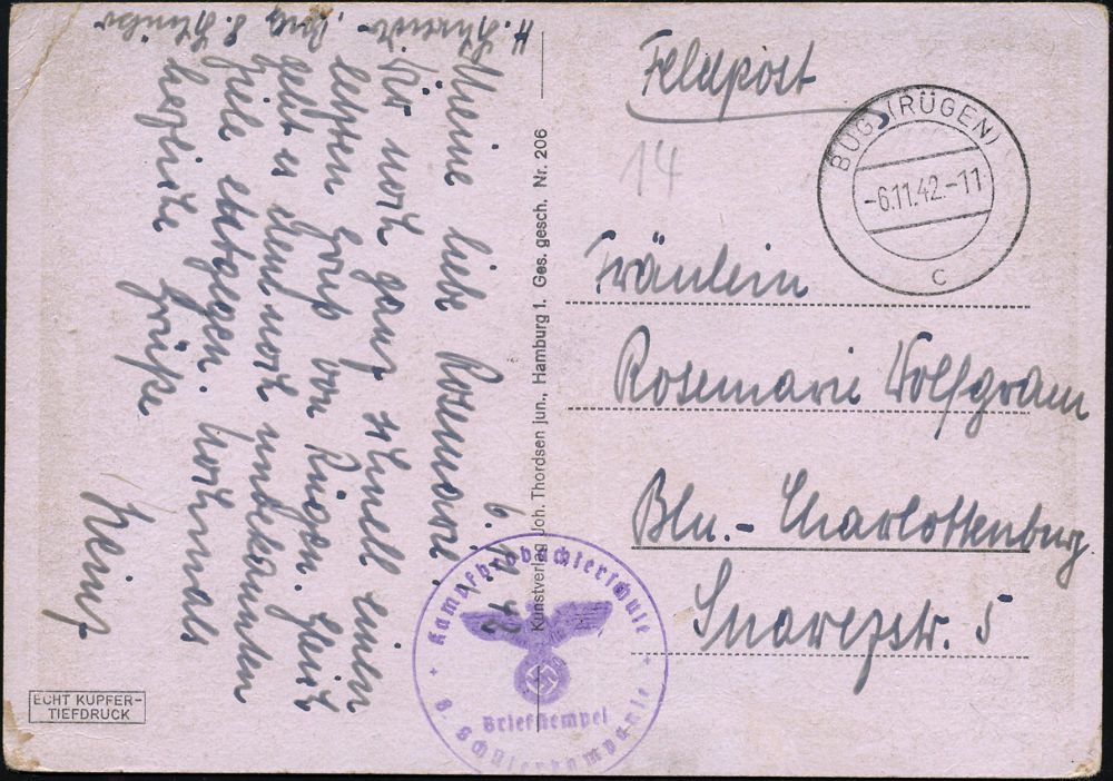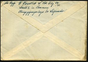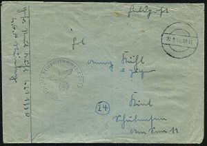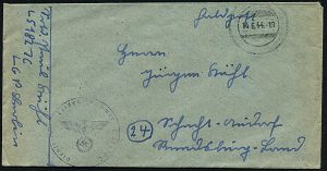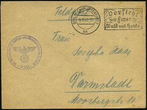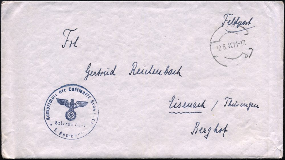 2927 | 16 € | II. WELTKRIEG: LUFTWAFFEN-EINHEITEN / LUFTFELDPOST 1939-45 : Groß Born-Linde 1942 (10.8.) stumme 1K-Brücke = Tarnstempel Truppenübungsplatz Groß Born + bl. 1K-HdN: Kampfschule der Luftwaffe Groß Born/1. Kompanie (rechts unten etw. undeutl.) rs. hs. Abs., Feldpost-Bf. + Inhalt n. Eisenach | ![]() ![]() | |