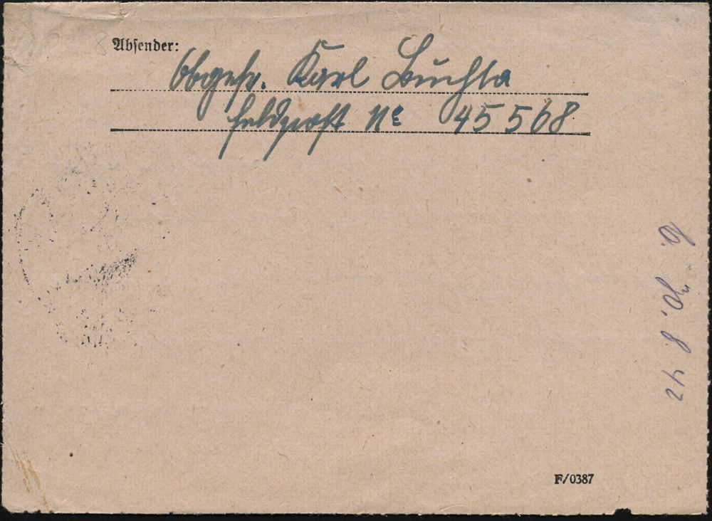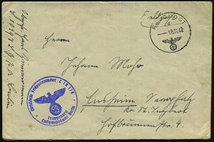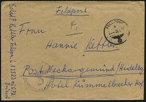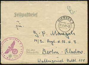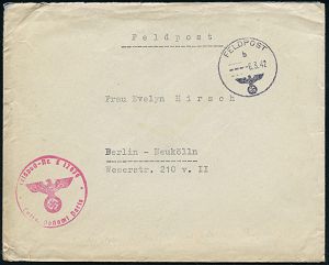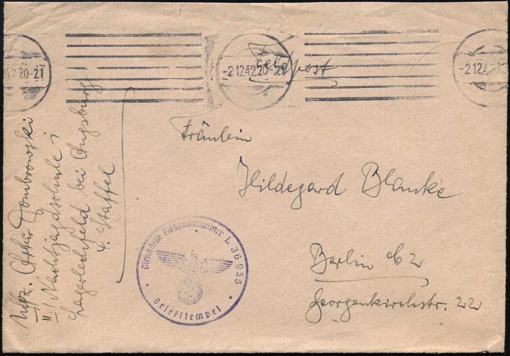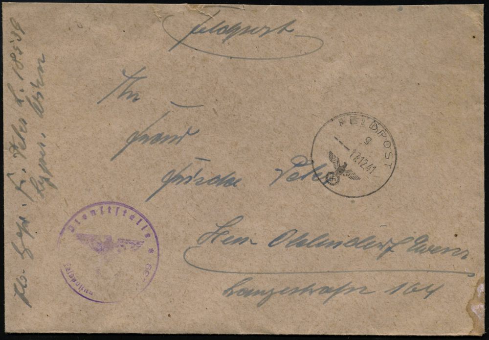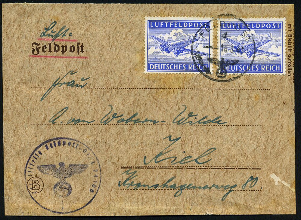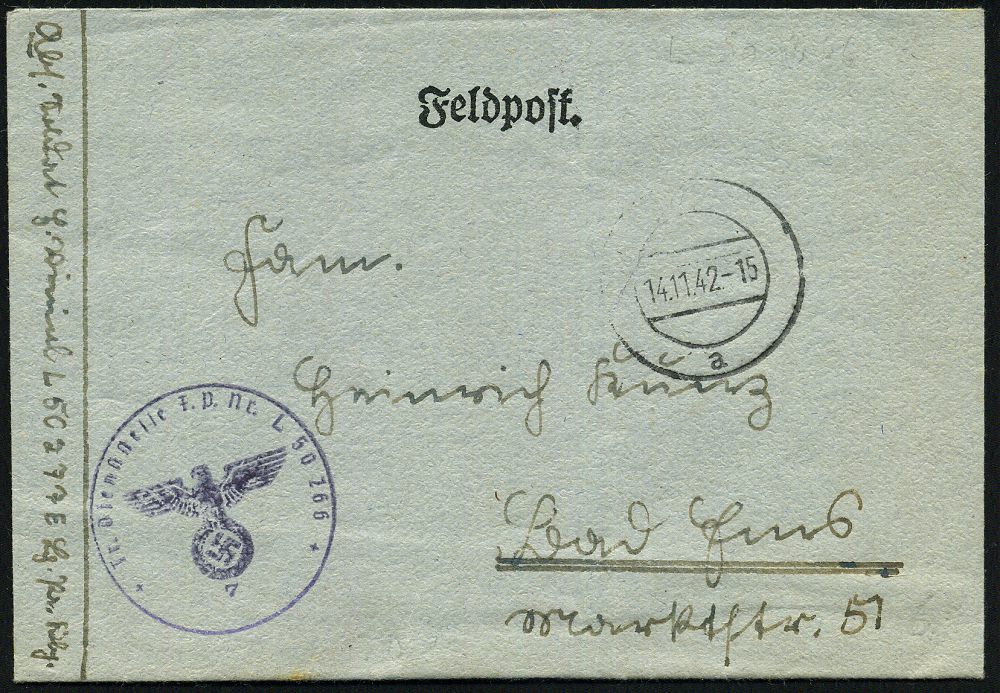 2969 | 10 € | II. WELTKRIEG: LUFTWAFFEN-EINHEITEN / LUFTFELDPOST 1939-45 : DEUTSCHES REICH 1942 (14.11.) stummer 2K-Steg = Tarnstempel + viol. 1K-HdN: Dienststelle F. P. Nr. L 50 266 = Luftwaffen-Feld-Div. 8 + vs. hs. Abs.: "..L 50 277 E Lg. Pa. Kbg." (= Königsberg) = Stab u. 9. - 12. Komp. Lw. Feld-Div. 8 , Feldpost-Falt-Bf. mit Inhalt n. Bad Grund | ![]() | |