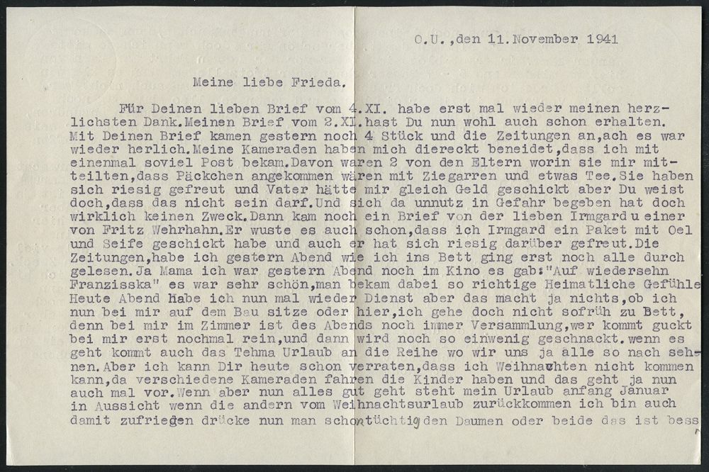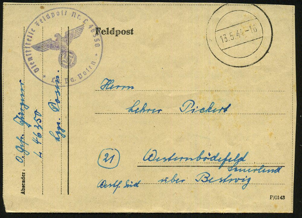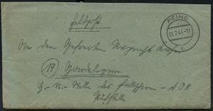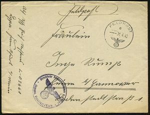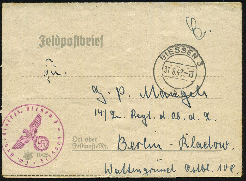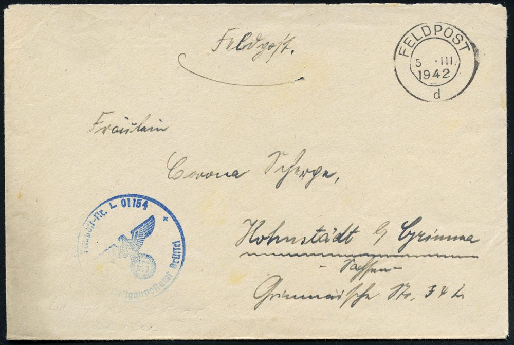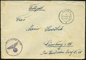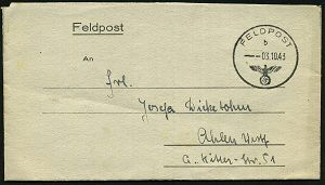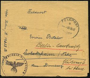 2969 | 10 € | II. WELTKRIEG: LUFTWAFFEN-EINHEITEN / LUFTFELDPOST 1939-45 : DEUTSCHES REICH 1942 (14.11.) stummer 2K-Steg = Tarnstempel + viol. 1K-HdN: Dienststelle F. P. Nr. L 50 266 = Luftwaffen-Feld-Div. 8 + vs. hs. Abs.: "..L 50 277 E Lg. Pa. Kbg." (= Königsberg) = Stab u. 9. - 12. Komp. Lw. Feld-Div. 8 , Feldpost-Falt-Bf. mit Inhalt n. Bad Grund | ![]() | |