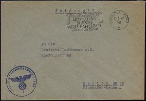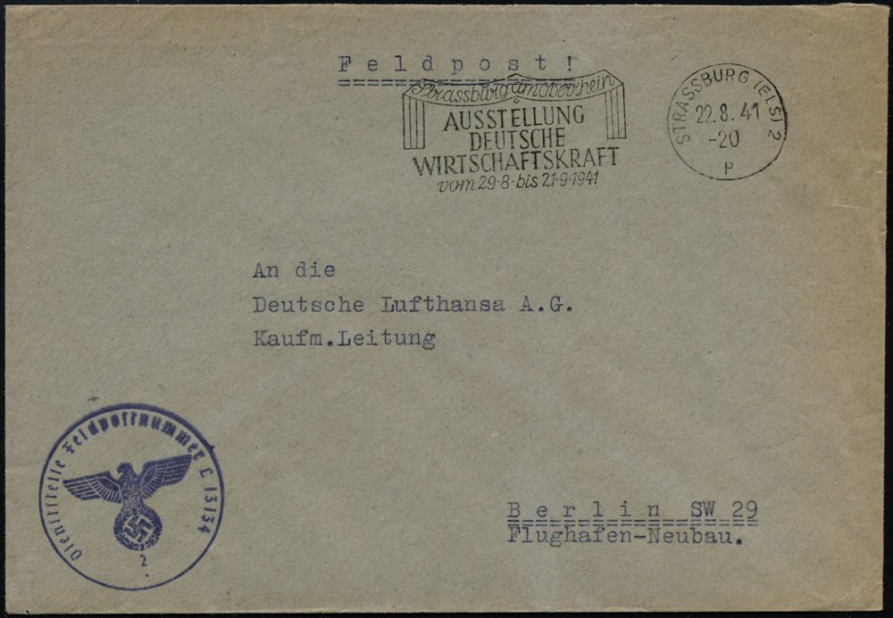 2951 | 18 € | II. WELTKRIEG: LUFTWAFFEN-EINHEITEN / LUFTFELDPOST 1939-45 : STRASSBURG (ELS) 2/ p/ AUSSTELLUNG/ DEUTSCHE/ WIRTSCHAFTSKRAFT.. 1941 (22.8.) MaWSt + bl. 1K-HdN: Fp. Nr. L 13 134 = Blindflugschule 3 , klar gest. Feldpost-Bf. an Deutsche Lufthansa! (Bo.12 A I) | ![]() | |