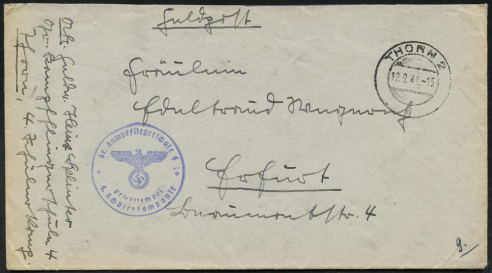 2955 | 15 € | II. WELTKRIEG: LUFTWAFFEN-EINHEITEN / LUFTFELDPOST 1939-45 : THORN 2/ d 1941 (9.9.) 2K-Steg + bl. 1K-HdN: Gr. Kampffliegerschule 4/4.Schülerkompanie + hs. Abs., klar gest. Feldpost-Bf. n. Erfurt | ![]() | |