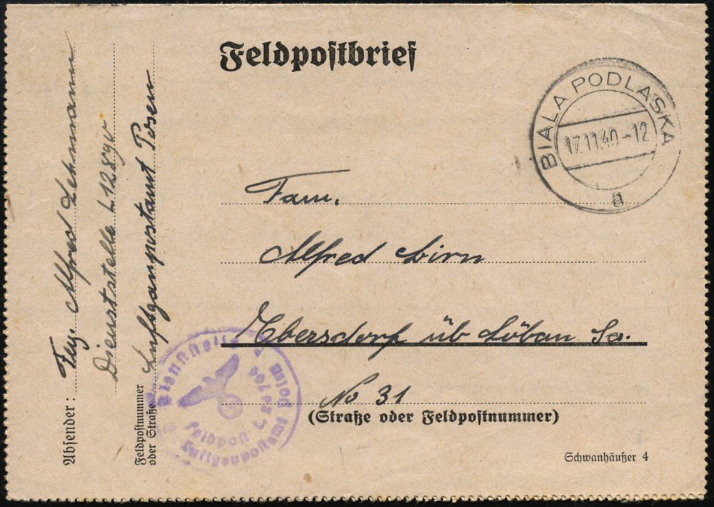 2988 | 12 € | II. WELTKRIEG: LUFTWAFFEN-EINHEITEN / LUFTFELDPOST 1939-45 : GENERALGOUVERNEMENT 1940 (17.11.) 2K-Steg: BIALA PODLASKA/a + viol. , kleiner 1K-HdN: Feldpost L 26 704/ Luftgaupostamt Posen = Stab Luftwaffen-Bau Btl. 1/I + hs. Abs. Fp.Nr. "L 12 890" = 2. Komp. Lw. Bau Batl. 1/I, klar gest. Feldpost-Faltbf. n. Ebersdorf | ![]() | |