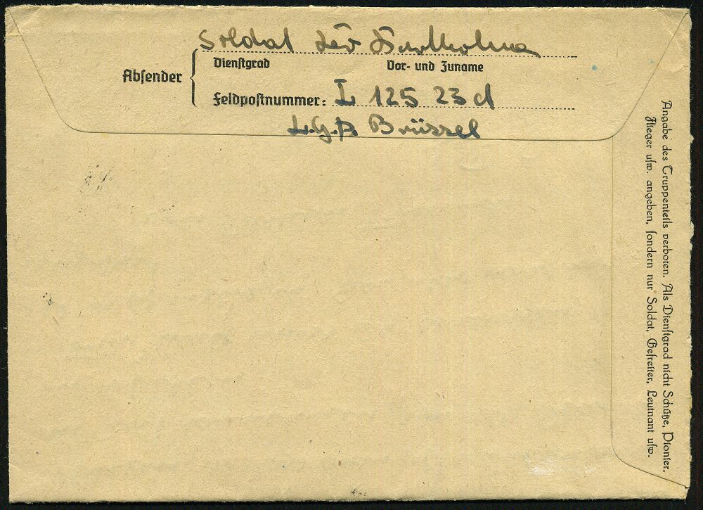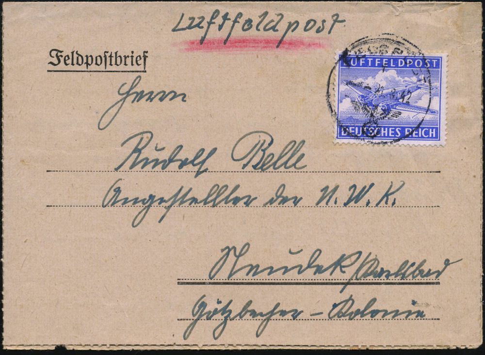 2992 | 12 € | II. WELTKRIEG: LUFTWAFFEN-EINHEITEN / LUFTFELDPOST 1939-45 : DT.BES.BELGIEN 1942 (5.3.) 2K-MaSt: FELDPOST/d = Brüssel (ohne Wellen) (Mi.15) + bl. HdN: Fp.Nr.L 01154 = Aufklärungs-Staffel 1 F 22 (links etw. undeutl., rs. Abs. entfernt) Feldpost-Bf. n. Hohnstädt/Grimma | ![]() | |