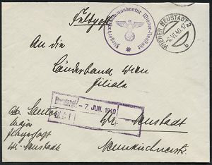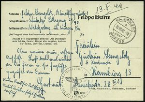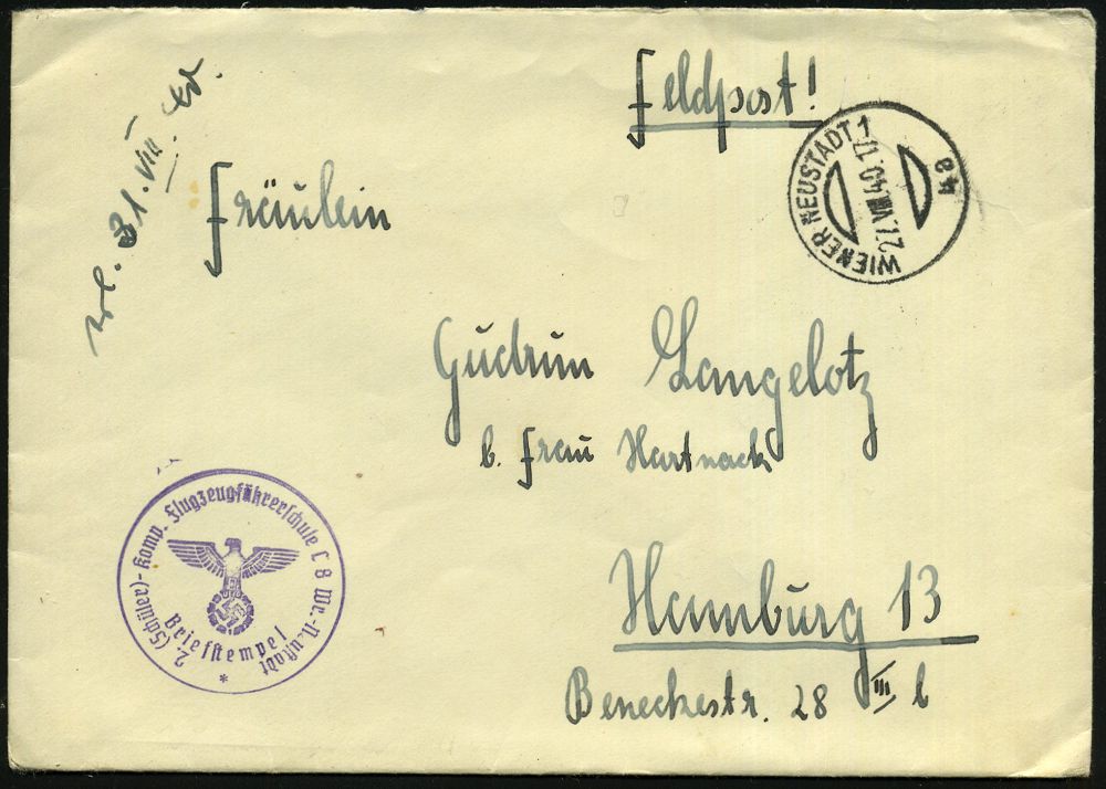 2958 | 15 € | II. WELTKRIEG: LUFTWAFFEN-EINHEITEN / LUFTFELDPOST 1939-45 : WIENER NEUSTADT 1/ 4a 1940 (27.8.) ehem., österr. 1K-Brücke + viol. 1K-HdN.: 2. (Schüler)-Komp. Flugzeugführerschule L 8 Wr.-Neustadt , rs. hs. Abs., klar gest. Felpost-Bf. + Inhalt n. Hamburg | ![]() | |