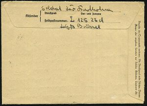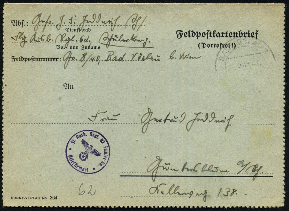 2910 | 10 € | II. WELTKRIEG: LUFTWAFFEN-EINHEITEN / LUFTFELDPOST 1939-45 : BAD VÖSLAU 1941 (25.2.) 2K-Steg (unten undeutl.) + Miniatur-HdN: Fl.(ieger) Ausb.(ildungs) Regt. 62 Schüler-Kp. + vs. hs. Abs., Feldpost-Falt-Bf. mit Inhalt n. Güntersblum | ![]() | |