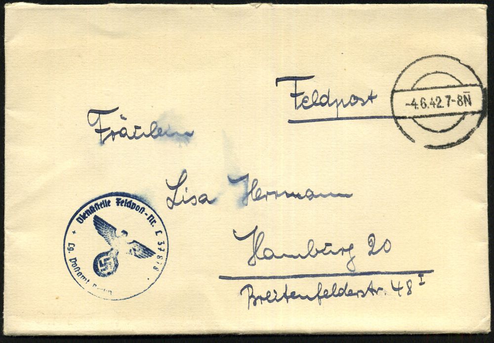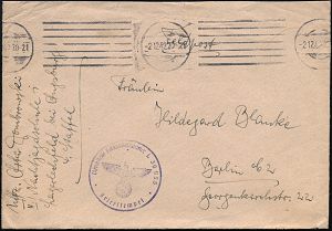 2916 | 15 € | II. WELTKRIEG: LUFTWAFFEN-EINHEITEN / LUFTFELDPOST 1939-45 : Berlin 1942 (4.6.) stumme 1K-Brücke = Tarnstempel Berlin + blauer 1K-HdN: Feldpost-Nr. L 37 878/Lg. Postamt Berlin = Ober-Kdo. Luftwaffe, General-Nachrichtenführer (Bf. rs. Klappenriß) Feldpost-Bf. + Inhalt n. Hamburg | ![]() | |