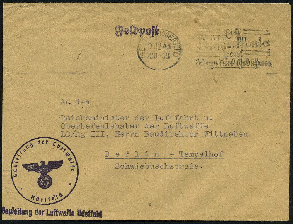 2919 | 18 € | II. WELTKRIEG: LUFTWAFFEN-EINHEITEN / LUFTFELDPOST 1939-45 : BEUTHEN (OBERSCHL)/ Ein/ Postscheckkonto/ spart/ Wege u.Gebühren 1943 (9.12.) Serien-MWSt, teils Sütterlin + viol. 1K-HdN: Bauleitung der Luftwaffe/ U d e t f e l d + 1L , Ernst Udet war Flieger-As I. Wk., General-Inspekteur Luftwaffe, Selbstmord 17.11.1941, Feldpost-Bf. an Luftfahrt-Ministerium (Bo.S 208 B) | ![]() | |