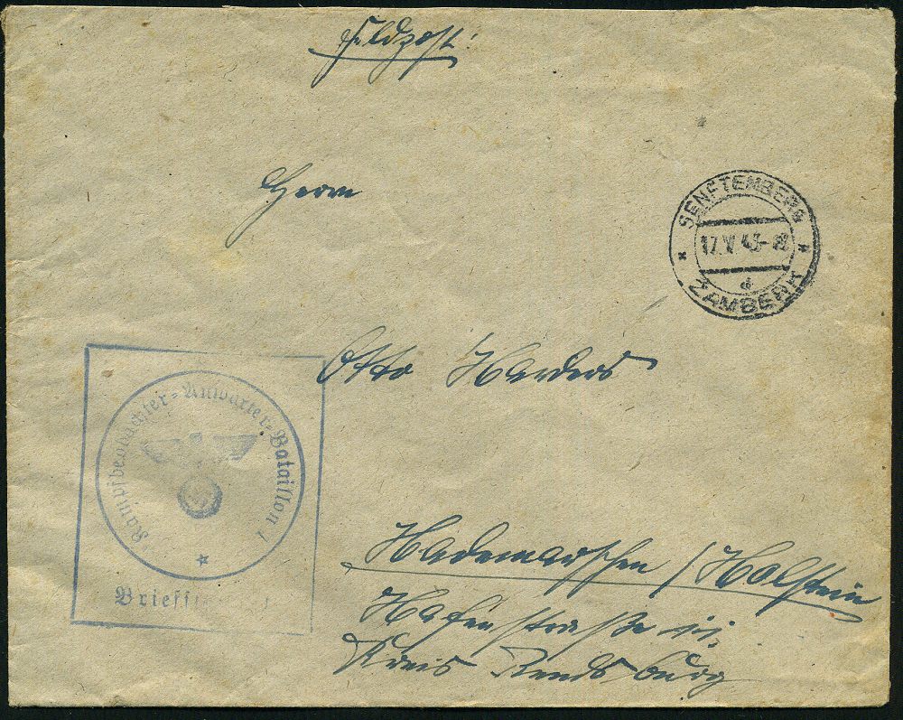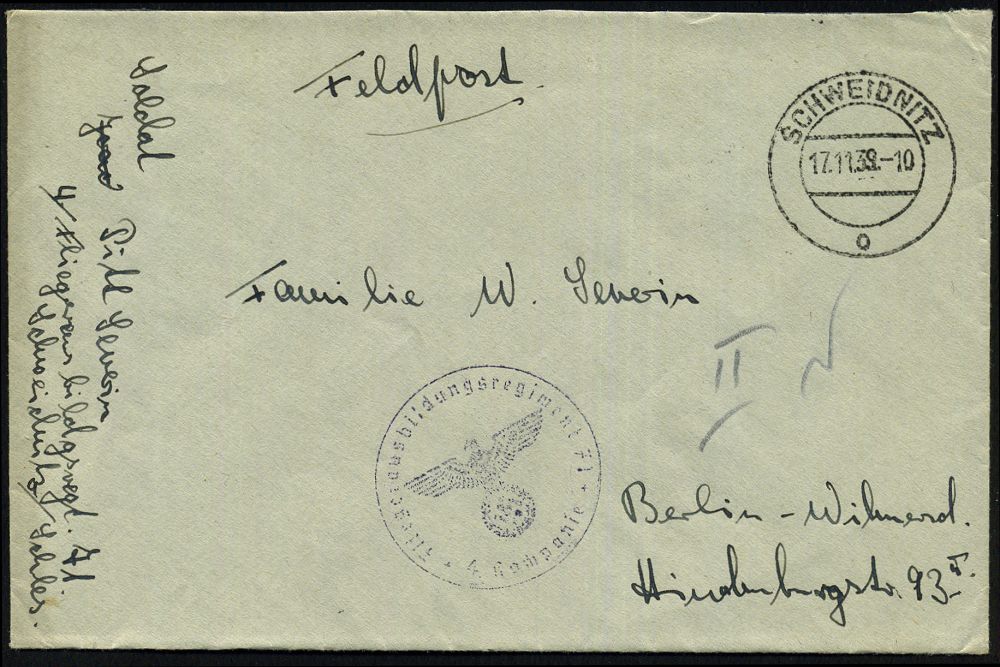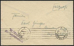 2909 | 15 € | II. WELTKRIEG: LUFTWAFFEN-EINHEITEN / LUFTFELDPOST 1939-45 : BADEN bei WIEN 1/ 9 h 1939 (20.9.) aptierter, österr. Band-MaSt (4 Wellen) + roter 2L: Gr. Kampffliegerschule Faßberg/1. Schülerkompanie, klar gest. Feldpost-Bf. n. Hannover | ![]() ![]() | |