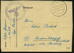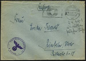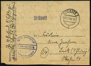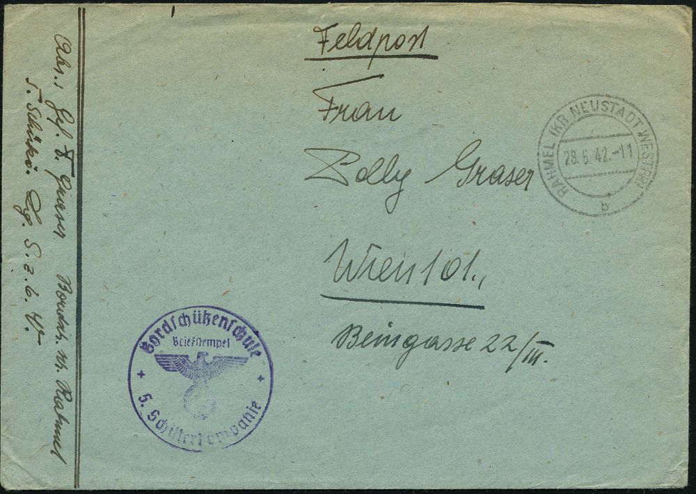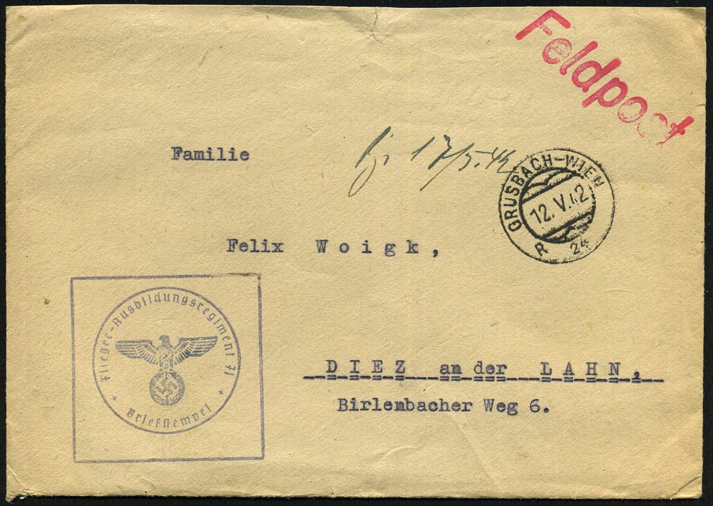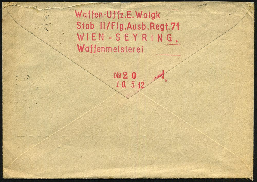 2928 | 15 € | II. WELTKRIEG: LUFTWAFFEN-EINHEITEN / LUFTFELDPOST 1939-45 : Wien-Seyring 1942 (12.V.) weiterverwendeter österr Bahn-2K: GRUSBACH - WIEN/R/24 + viol. Ra.: Flieger-Ausbildungs-regiment 71 , rs. roter Setzkasten-Absender-4L: Waffen-Uffz... Stab II Flg. Ausb. Regt. 71/ WIEN-SEYRING/ Waffenmeisterei, klar gest. Feldpost-Bf. (oben 1x Riß) + viel Inhalt n. Diez | ![]() ![]() | |