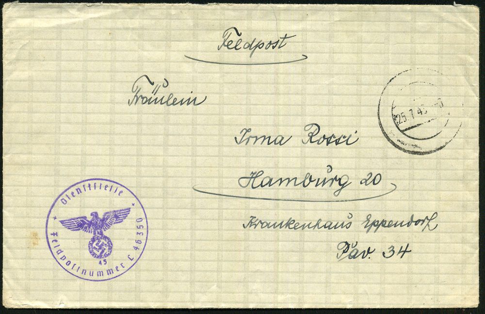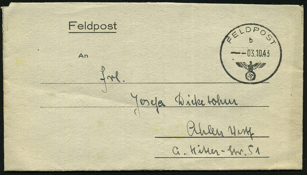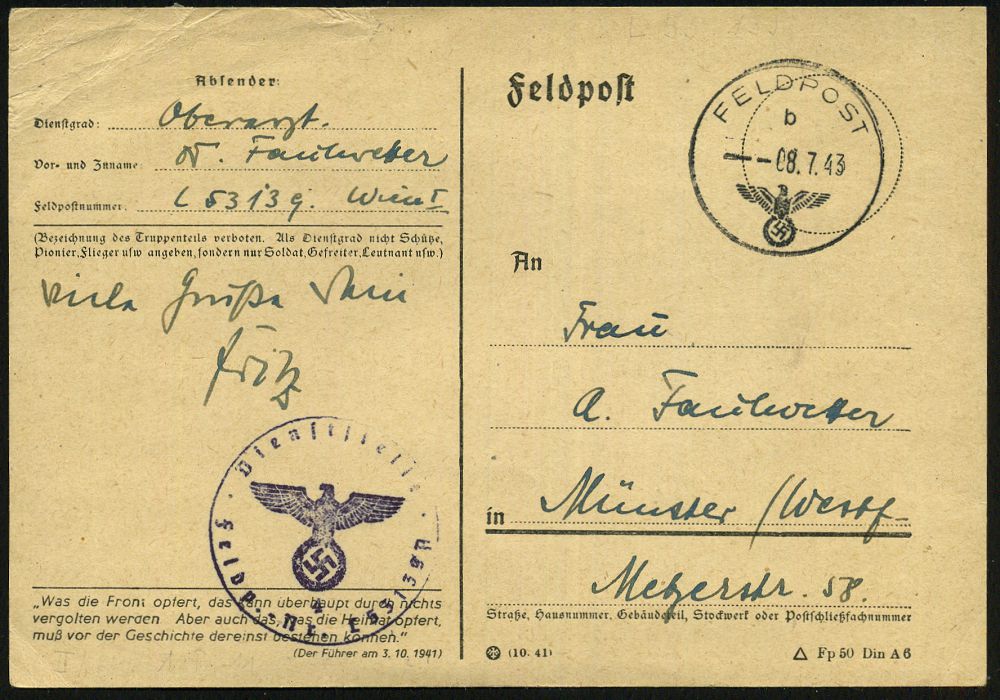 2973 | 12 € | II. WELTKRIEG: LUFTWAFFEN-EINHEITEN / LUFTFELDPOST 1939-45 : DEUTSCHES REICH 1943 (15.5.) 1K: FELDPOST/a/--- auf EF Luftfeldpostmke. gez. (Ju 52) + viol. 2L: Oberleutnant WOLFF/ Felp.-Nr. 05213 = 1. Sanitäts-Sanitäts-Zug 19 (19. Inf.-Div.) klar gest. Feldpost-Bf. (rs. Eckfehler) + Inhalt n. Hildesheim (Mi.1) | ![]() | |