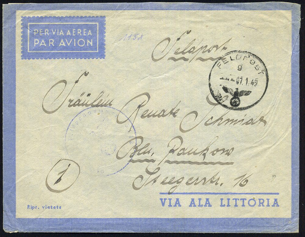 3003 | 20 € | II. WELTKRIEG: LUFTWAFFEN-EINHEITEN / LUFTFELDPOST 1939-45 : DT.BES.ITALIEN 1945 (7.1.) 1K: FELDPOST/g/--- + viol. 1K-HdN: Feldpostnr. 43118 = Feld-Lazarett 3 (teils undeutl.) + rs. hs. Abs., später, italienischer Beute-Luft-Feldpost-Bf. (kl. unsichtbarer Riß) rs. Logo ALA LITTORIA n. Berlin | ![]() ![]() | |