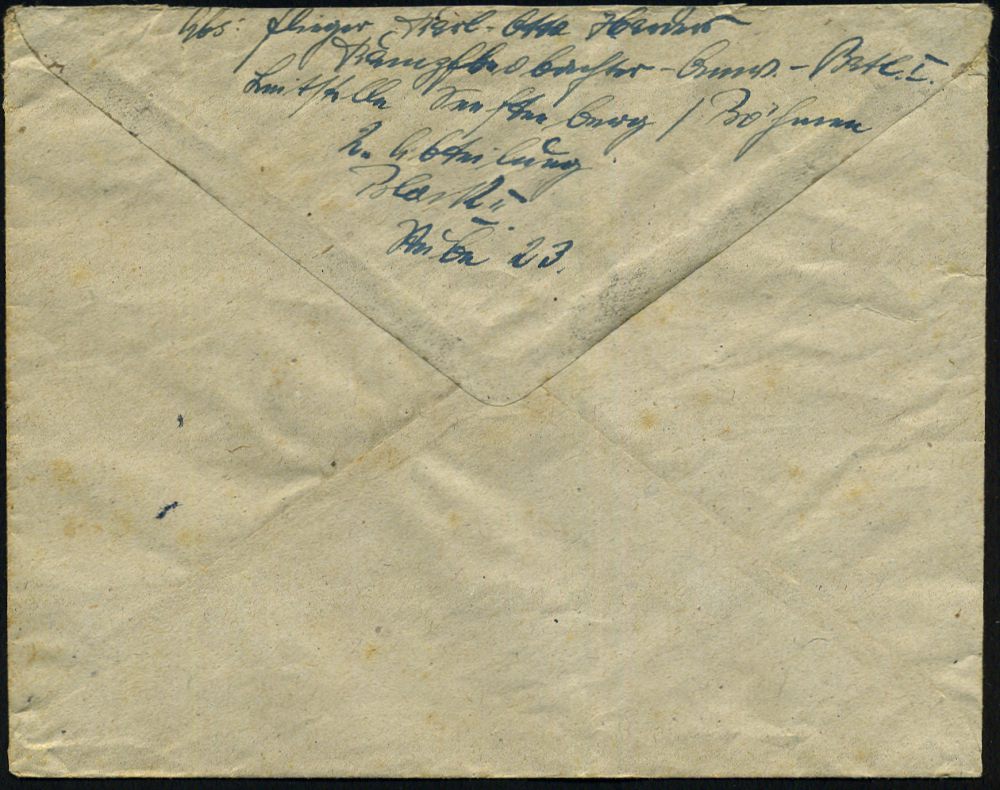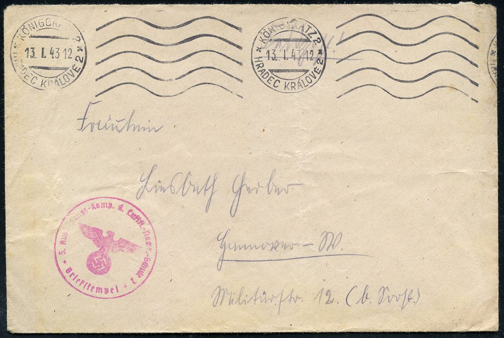 2986 | 15 € | II. WELTKRIEG: LUFTWAFFEN-EINHEITEN / LUFTFELDPOST 1939-45 : BÖHMEN & MÄHREN 1943 (13.1.) Band-Ma.WellenSt. : KÖNIGGRÄTZ 2/ HRADEC KRALOVE 2 (5 Wellen) + roter 1K-HdN: 5. Ausbildungs-Komp. d. Luftfl.(otten)-Nachr.(ichten)-Schule 2 + rs. hs. Abs., Feldpost-Bf. n. Hannover | ![]() | |