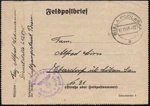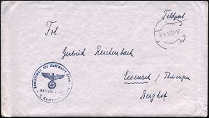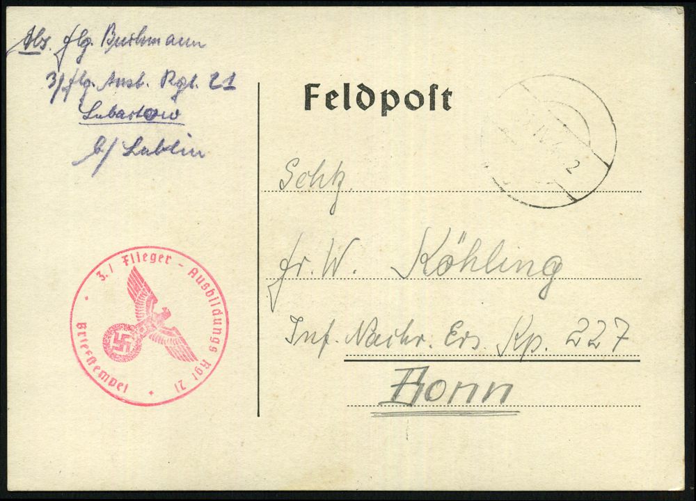 2990 | 14 € | II. WELTKRIEG: LUFTWAFFEN-EINHEITEN / LUFTFELDPOST 1939-45 : GENERALGOUVERNEMENT 1941 (17.4.) stumme 1K-Brücke = Tarnstempel (Lublin ?) + roter 1K-HdN: 3./ Flieger-Ausbildungs Rgt. 21 + hs. Abs.: ".. Ausb. Rgt. 21, Lubartow.." , Feldpost-Kt. n. Bonn | ![]() | |