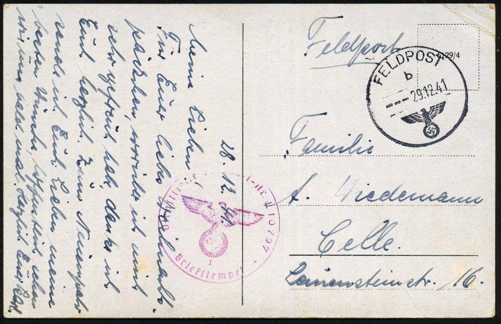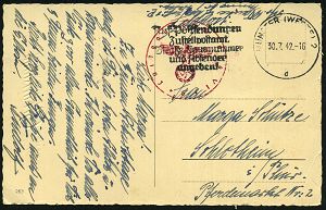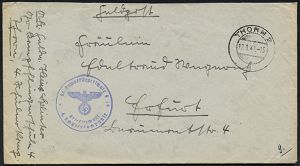 2941 | 16 € | II. WELTKRIEG: LUFTWAFFEN-EINHEITEN / LUFTFELDPOST 1939-45 : MÜNSTER (WESTF) 2/ dd/ EIGENE VORSICHT/ BESTER UNFALLSCHUTZ #bzw.# Auf Postsendungen/ Zustell-postamt../ angeben. 1941/42 2 verschiedene MWSt + viol. bzw. roter 1K-HdN: Luftgau-kommando VI/K. Stelle bzw. 6 + je hs. Abs., Feldpost-Bf. + Inhalt bzw. 2 Feldpost-Ktn., 3 Belege (Bo.S 235 A, 268 A) | ![]() ![]() ![]() | |