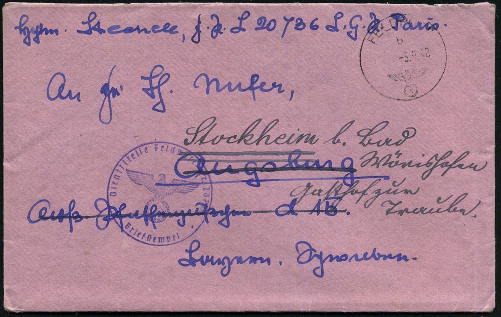 2996 | 12 € | II. WELTKRIEG: LUFTWAFFEN-EINHEITEN / LUFTFELDPOST 1939-45 : DT.BES.FRANKREICH 1940 (3.9.) 1K: FELDPOST/b + viol. 1K-HdN: Dienststelle Feldpostnr. L 20 736 = Luftflotten-Kdo. 3 (LGPA Paris) , nachgesandter Feldpost-Bf. n. Augsburg/Stockheim | ![]() | |