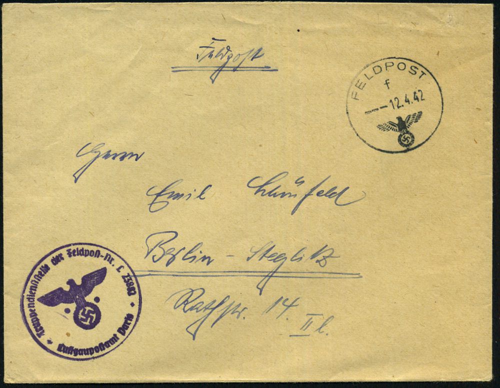 2998 | 12 € | II. WELTKRIEG: LUFTWAFFEN-EINHEITEN / LUFTFELDPOST 1939-45 : DT.BES.FRANKREICH 1942 (12.4.) 1K: FELDPOST/f/--- + viol. 1K-HdN: Feldpost-Nr. L 23882/ Luftgaupostamt Paris = Luftgau-Kommando Westfrankreich , rs. hs. Abs., klar gest. Feldpost-Bf. n. Berlin | ![]() ![]() | |