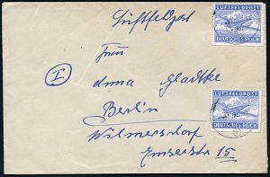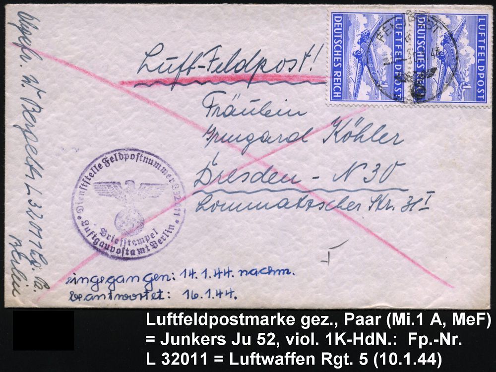 2978 | 14 € | II. WELTKRIEG: LUFTWAFFEN-EINHEITEN / LUFTFELDPOST 1939-45 : DEUTSCHES REICH 1944 (10.1.) gez. Luftfeldpost-Marke Ju 52, reine MeF = Paar, 1K: FELDPOST + viol. 1K-HdN: ..Feldpost-nummer L 32011 = Luftwaffen-Regt. 5 + hs. Abs., sauber gest. Luft-Feldpost-Bf. n. Dresden (Mi.1 A , MeF) | ![]() | |