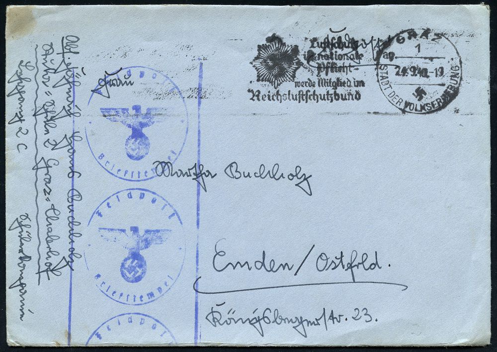 2926 | 40 € | II. WELTKRIEG: LUFTWAFFEN-EINHEITEN / LUFTFELDPOST 1939-45 : GRAZ/ 1/ ag/ SDV/ Luftschutz/ ist nationale/ Pflicht.. 1940 (24.9.) Serien-MWSt + seltener, blauer R o l l - Briefstempel: Feldpost/ Briefstempel (ohne weitere Angaben, Mi.133 + 100.- EUR) + hs. Abs.: "..Schule 2 Graz-Chalerhof Lehrgang 2 C, Schülerkompanie", Feldpost-Bf. n. Emden (Bo.S 325 A, nur 1 1/2 Jahre in nur 9 Orten) | ![]() | |
