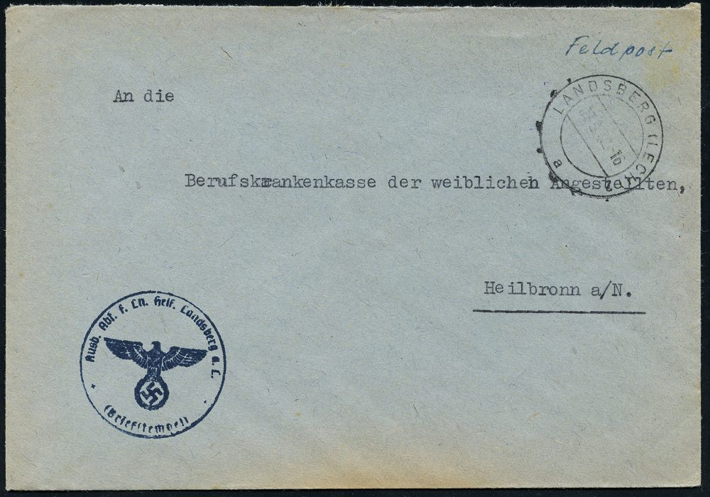 2936 | 14 € | II. WELTKRIEG: LUFTWAFFEN-EINHEITEN / LUFTFELDPOST 1939-45 : LANDSBERG (LECH)/ a 1942 (7.9.) 2K-Steg + blauer 1K-HdN: Ausb.(ildungs) Abt. f. Ln. Helf.(erinnen)Landsberg a. L. + rs. Abs.-2L: Ausb. Abt. f. Ln.-Helferinnen.. = weibliche Luftwaffen-Angehörige!, klar gest. Feldpost-Bf. n. Heilbronn | ![]() ![]() | |