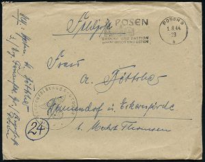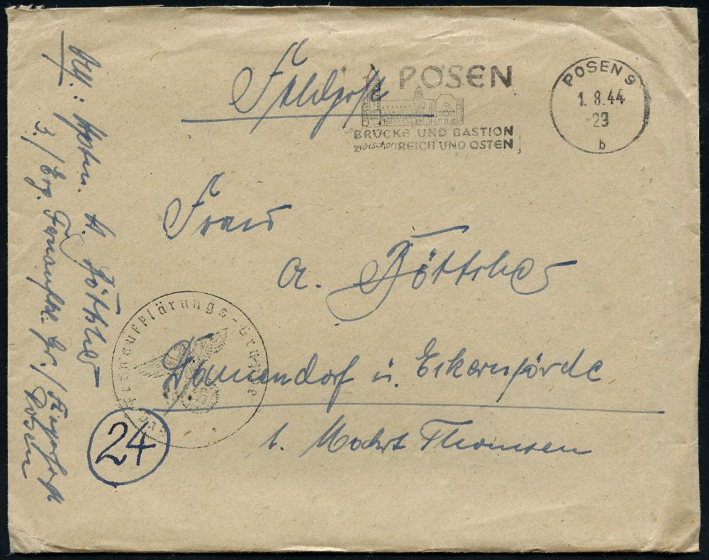 2947 | 15 € | II. WELTKRIEG: LUFTWAFFEN-EINHEITEN / LUFTFELDPOST 1939-45 : POSEN 9/ b/ BRÜCKE U.BASTION/ zwischen reich U.OSTEN 1944 (1.8.) MWSt + viol. 1K-HdN: Erg.-Fern-Aufklärungs-Gruppe + hs. Abs.: "..Fliegerhorst Posen" , Feldpost-Bf. + viel Inhalt n. Eckernförde (Bo.14 A II = UB "b" = Letztjahr!) | ![]() | |
