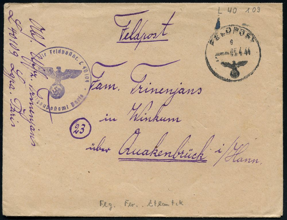 2999 | 20 € | II. WELTKRIEG: LUFTWAFFEN-EINHEITEN / LUFTFELDPOST 1939-45 : DT.BES.FRANKREICH 1944 (5.4.) 1K: FELDPOST/g/--- + viol. 1K-HdN: Fp.-Nr. L 40 109 = Flieger-Führer Atlantik = Einsatz von Geleitzug-Aufklärung u. Bekämpfung von alliierten Geleitzügen! + hs. Abs. (LGPA Paris), seltener Feldpost-Bf. (rs. Klappenriß) + Inhalt n. Quakenbrück | ![]() | |