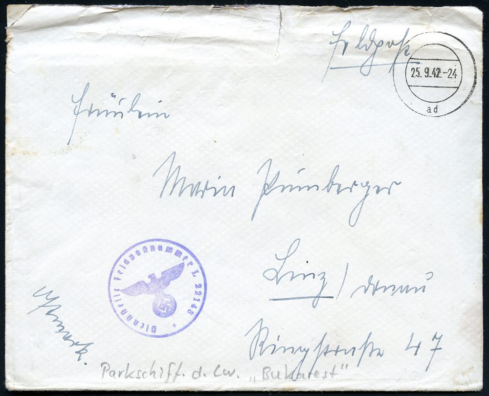 2968 | 14 € | II. WELTKRIEG: LUFTWAFFEN-EINHEITEN / LUFTFELDPOST 1939-45 : DEUTSCHES REICH / RUMÄNIEN 1942 (25.9.) stummer 2K-Steg "ad" = Tarnstempel + viol. 1K-HdN: Fp.-Nr. L 22 143 = Parkschiff der Lw. "Bukarest" + rs. hs. Abs. (Bf. oben Riß geschl.) Feldpost-Bf. + Inhalt n. Linz | ![]() | |