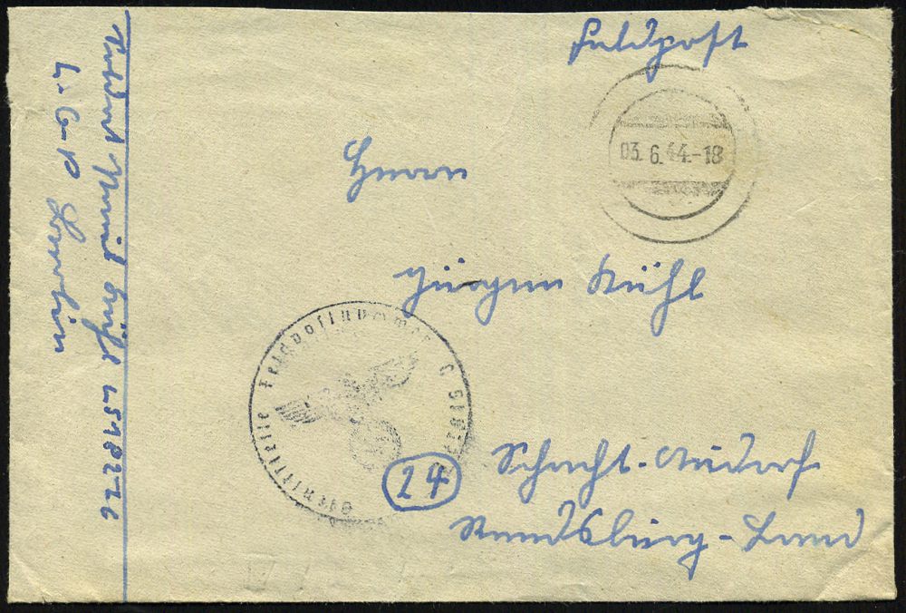 2964 | 15 € | II. WELTKRIEG: LUFTWAFFEN-EINHEITEN / LUFTFELDPOST 1939-45 : DEUTSCHES REICH 1944 (5.6.) durchst. Luftfeldpost-Marke, blau, MeF: 2 Stück (Ju 52) + rs. hs. Fp.-Nf.: 00929 = Panzer-Aufklärungs-Abt. 26 , Luft-Feldpost-Bf. n. Berlin (Mi.1 B, MeF) | ![]() | |
