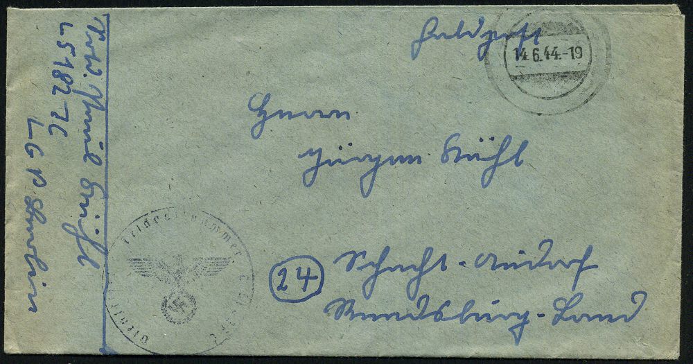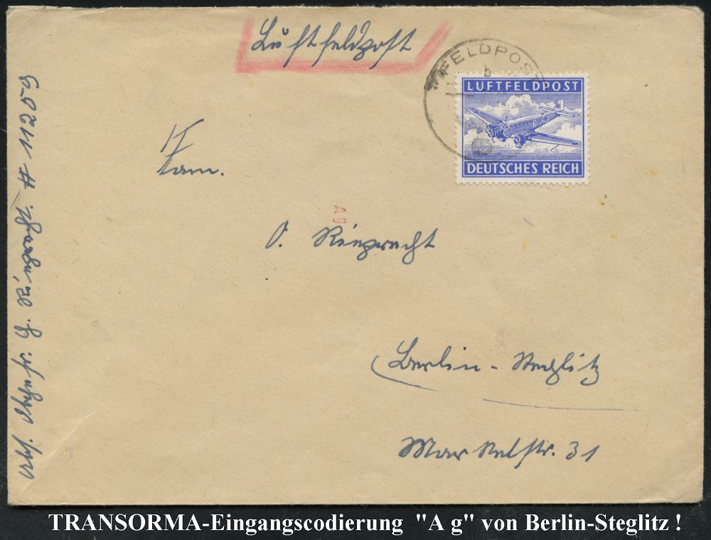 2982 | 16 € | II. WELTKRIEG: LUFTWAFFEN-EINHEITEN / LUFTFELDPOST 1939-45 : DEUTSCHES REICH 1944 (1.7.) 1K: FELDPOST/b/--- auf EF durchst. Luftfeldpost-Marke (Ju 52) + hs. Fp.-Abs.: 59995 = Feld-Ers. Batl. 179, bei Jasny im August vernichtet!, klar gest. Feldpost-Bf., rs. 3 Verschlußmarken: Heeres-Nachrichtendienst n. Bad Kreuznach (Mi.1 B, EF) | ![]() ![]() | |