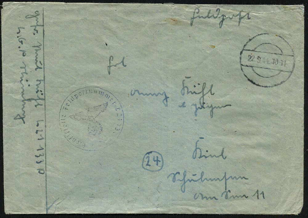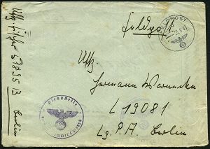 2976 | 16 € | II. WELTKRIEG: LUFTWAFFEN-EINHEITEN / LUFTFELDPOST 1939-45 : DEUTSCHES REICH 1943 (Juli/Okt.) 2x 1K: FELDPOST/b/--- + viol. 1K-HdN: Feldpost-Nr. L 49 258 (Lg. Pa. Posen) = Luftwaffen Artl. Rgt. 4, dann Sturmgeschütz Battr. Panzer-Jäger Abt., Lw. Feld-Div. 4 , 2 nachgesandte Feldpost-Falt-Briefe mit Inhalt n. Bln., 2 Belege | ![]() ![]() | |