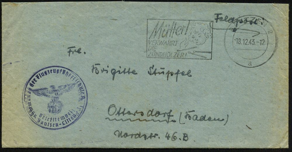 2912 | 20 € | II. WELTKRIEG: LUFTWAFFEN-EINHEITEN / LUFTFELDPOST 1939-45 : BAUTZEN 2/ a/ Mütter!/ VERWAHRT/ DIE/ ZÜNDHÖLZER! 1943 (18.12.) seltener Serien-MWSt (Kinderkopf, 3 Zündhölzer) + blauer 1K-HdN: Kommando der Flugzeugführerschule A/ Bautzen-Litten + rs. hs. Abs. + Luftwaffen-Vignette mit Hakenkreuz, Feldpost-Bf. + Inhalt n. Ottersdorf | ![]() ![]() | |