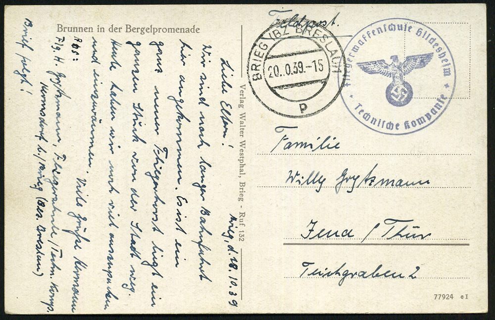 2920 | 16 € | II. WELTKRIEG: LUFTWAFFEN-EINHEITEN / LUFTFELDPOST 1939-45 : BRIEG (BZ BRESLAU) 1/ p 1939 (20.10.) 2K-Steg + viol. 1K-HdN: Fliegerwaffenschule Hildesheim/ Techn. Kompanie , klar gest. Feldpost-s/w.-Foto-Ak.: Brunnen Bergelpromenade n. Jena | ![]() ![]() | |