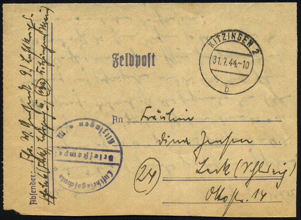 2931 | 14 € | II. WELTKRIEG: LUFTWAFFEN-EINHEITEN / LUFTFELDPOST 1939-45 : KITZINGEN 2/ b 1944 (Juli/Aug.) 2x 2K-Steg + viol. Steg-HdN: Luftkriegsschule 6/ Kitzingen a. M. + hs. Abs.: "9. (Kompanie) Luftkriegsschule 6.." , 1x Feldpost-Falt-Bf. mit Inhalt u. 1x Feldpost-Bf. (ohne Inhalt),, 2 Belege | ![]() ![]() | |