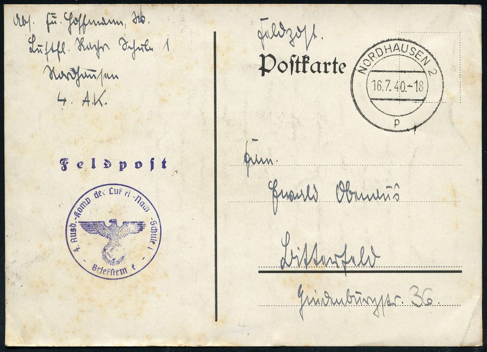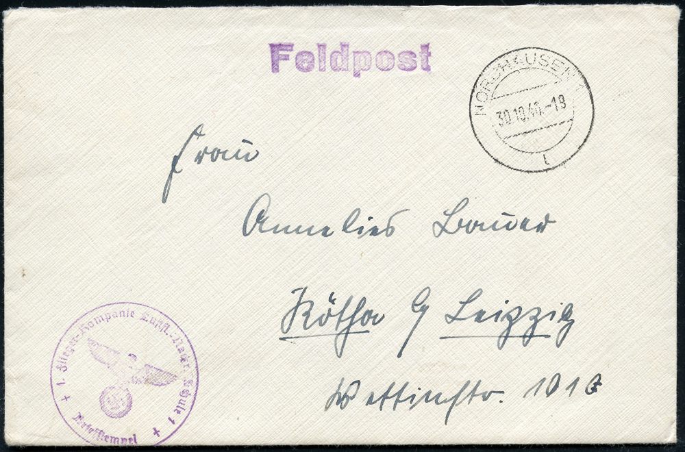2944 | 15 € | II. WELTKRIEG: LUFTWAFFEN-EINHEITEN / LUFTFELDPOST 1939-45 : Nordhausen 2 1940/42 2 verschiedene Briefstempel: Luftflotten-Nachrichten-Schule 1, 1. Flieger-Komp. etc., Feldpost-Bf. + Inhalt bzw. Feldpost-Kt. (Eckbugspur), 2 Belege | ![]() ![]() | |