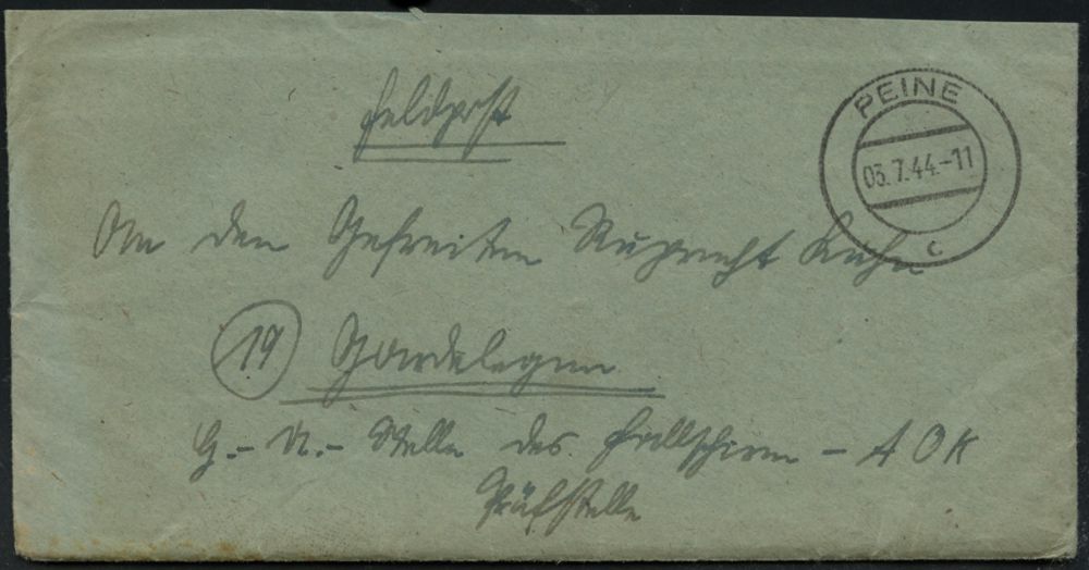 2946 | 25 € | II. WELTKRIEG: LUFTWAFFEN-EINHEITEN / LUFTFELDPOST 1939-45 : PEINE/ c 1944 (3.7.) 2K-Steg auf kleinem Feldpost-Bf. + viel Inhalt an: G. U.- Stelle der F a l l s c h i r m - A O K Prüfstelle , 2 Belege kompl.! | ![]() | |