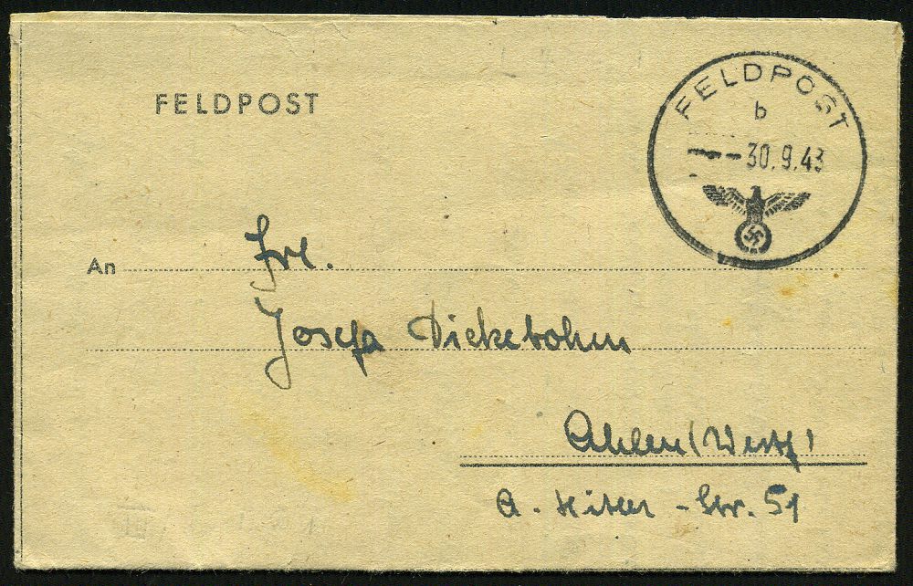 2971 | 18 € | II. WELTKRIEG: LUFTWAFFEN-EINHEITEN / LUFTFELDPOST 1939-45 : DEUTSCHES REICH 1943 (März/Sept.) 2x 1K: FELDPOST/b/--- bzw. FELDPOST/J/--- (Mi.10) 1x hs. Abs.: "L 52 763, Lg Pa Posen 2" = Stab Luftwaffen-Art.-Rgt.3 bzw. viol.1K-HdN: Feldpost-Nr. L 53139 bzw. L 51895 = Lw. Art. Rgt. 11 bzw. 14 (Lg. Pa. Berlin) 2 Feldpost-Karten (1x oben kl. Riß) und 1 Feldpost-Bf. + Inhalt = Wende-Brief (2x verwendet!), 3 Belege | ![]() ![]() ![]() | |