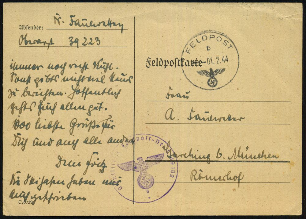 2979 | 12 € | II. WELTKRIEG: LUFTWAFFEN-EINHEITEN / LUFTFELDPOST 1939-45 : DEUTSCHES REICH 1944 (26.1./1.2.) 2x 1K: FELDPOST/b/--- + je viol. 1K-HdN: Feldpost-Nr. 49182 = Stab, 11. Luftwaffen-Feld-Division 2x vs. hs. Abs.: "Oberarzt.. 39223" bzw. "42470 A" = Kdo. 11. Lw. Feld-Div. , 2 Feldpost-Karten (1x 2 kl. Rißchen) klar gest. n. Garching | ![]() ![]() | |