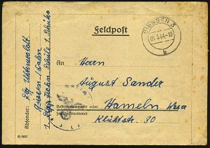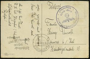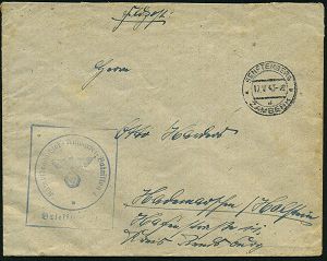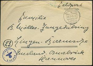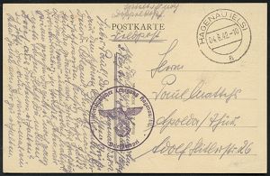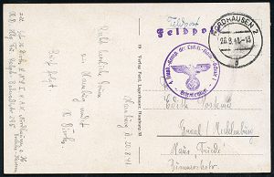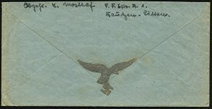2922 | 25 € | II. WELTKRIEG: LUFTWAFFEN-EINHEITEN / LUFTFELDPOST 1939-45 : DESSAU 1/ o 1941 (13.6.) 2K-Steg + blauer 1K-HdN: Höhere Fliegertechnische Schule/Jndustrie-Lehrgang Dessau + hs. Abs.: ".. Flg. Techn. Schule/ J u n k e r s Motorenwesen" , seltene Feldpost-Kt. an Fp.-Nr. L 36 742 = Küsten-Fliegergruppe 906, Einsatz Nordsee gegen brit. Seeverkehr, weitere Belege zum Thema JUNKERS siehe Sektion: LUFTWAFFE | ![]() | |
