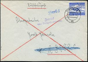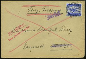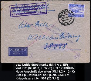 2934 | 20 € | II. WELTKRIEG: LUFTWAFFEN-EINHEITEN / LUFTFELDPOST 1939-45 : KONSTANZ 1/ c 1943 (25.3.) 2K-Steg auf Luftfeldpostmke. gez., EF (Ju 52) + viol. Ra.3: Einheit d.Empfängers nimmt z.Zt./nicht am Luftfeldpostdienst teil/b Luftfeldpostsammelstelle___/___ (Mi.31 b + 25.- EUR) + 2L: ZURÜCK/ Neue Anschrift abwarten (+ 10.- EUR) klar gest. Luftfeldposz-Retour-Bf. (schwache Falte) an Fp.-Nr.38 398 = = Kriegslazarett 907, seltene Kombination! (Mi.1 A a) | ![]() | |