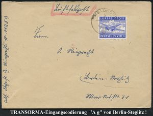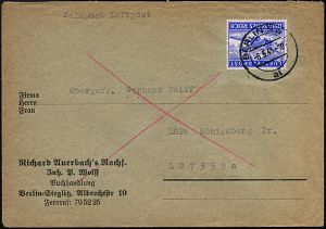 2918 | 10 € | II. WELTKRIEG: LUFTWAFFEN-EINHEITEN / LUFTFELDPOST 1939-45 : BERLIN SW 11/ ai 1943 (6.5.) 2K-Steg auf Luftfelddp.-Marke gez., EF (Ju 52) Firmen-Bf.: Rich. Auerbachs Nachf. Bln-Steglitz (schwache Bräunung) Luft-Feldpost-Bf. an Fp.-Nr. L 27 359 A = Luftwaffen-Feld-Rgt. 1 (Mi.1 A) | ![]() | |