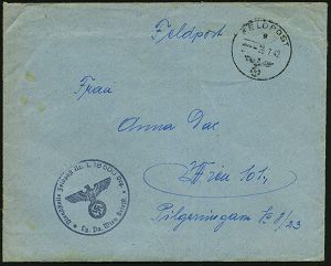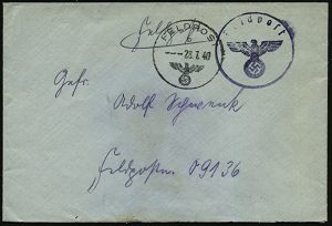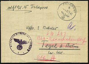 2962 | 14 € | II. WELTKRIEG: LUFTWAFFEN-EINHEITEN / LUFTFELDPOST 1939-45 : DEUTSCHES REICH 1940 (28.7.) 1K: FELDPOST/b/-- + schw.-blauer 1K-HdN: Feldpost + rs. hs. Abs.: "L 14 994 Luftgaupostamt Ffm." = Fliegerhorst Kdr. E 15/VII , Feldpost-Bf. an Fp.-Nr. 09136 | ![]() ![]() | |