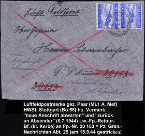 2953 | 16 € | II. WELTKRIEG: LUFTWAFFEN-EINHEITEN / LUFTFELDPOST 1939-45 : STUTTGART/ 2/ c/ SDA 1944 (6.7.) HWSt (Bo.56) auf gez. Paar Luftfeldpostmarke (Ju 52) + hs. Vermerk "zurück an Absender neue Anschrift abwarten" , Luft-Feldpost-Retour-Bf. (oben Kerbe) an Fp.-Nr. 20 153 (= Panzer-Gren. Nachrichten-Abt. 25) wurde am 18.9.1944 gestrichen, d.h. vernichtet! | ![]() | |