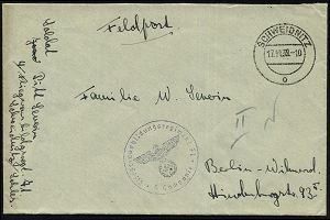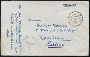 3001 | 16 € | II. WELTKRIEG: LUFTWAFFEN-EINHEITEN / LUFTFELDPOST 1939-45 : DT.BES.GRIECHENLAND 1941 (12.11.) 1K: FELDPOST/i/--- + viol. 1K-HdN: Fp. Nr. L 18 539 = Flieger-Nachschub-Abt. Stab Südost, Griechenland (Lgpa Wien) Feldpost-Bf. + Inhalt, Text über Kino-Besuch u. Einrichtung eines "K.d.F.-Theaters" (wahrscheinl. Athen) n. Hess. Oldendorf | ![]() ![]() ![]() | |