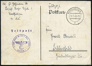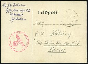 2943 | 16 € | II. WELTKRIEG: LUFTWAFFEN-EINHEITEN / LUFTFELDPOST 1939-45 : NORDHAUSEN 2/ p 1940/41 2x 2K-Steg + blauer bzw. viol. 1K-HdN: 4. Ausb.(ildungs)-Komp. der Luftfl.(otten)-Nachr. (ichten)-Schule 1 , 2 verschiedene Feldpost-Karten, je mit hs. Abs., 2 Belege | ![]() ![]() | |