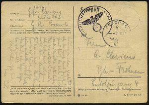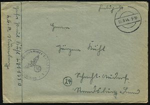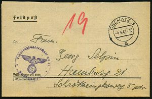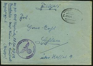 2952 | 16 € | II. WELTKRIEG: LUFTWAFFEN-EINHEITEN / LUFTFELDPOST 1939-45 : Strebielin/ Westpr. 1943 (21.3.) Bahn-Oval (rechts etw. undeutl.) + viol. 1K-HdN: Flugzeugführerschule A/B 52 /Arbeitsplatz Strebielin + hs. Abs.: "..F. F. Sch. A-B 52, Strebielin.. Kr. Neustadt (Westpr.)..", seltener Feldpost-Bf. + Inhalt n. Ehlau | ![]() | |