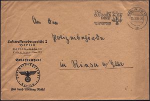 2915 | 20 € | II. WELTKRIEG: LUFTWAFFEN-EINHEITEN / LUFTFELDPOST 1939-45 : BERLIN SW11/ ab/ TAG der/ DEUTSCHEN/ KUNST/ zu München.. 1939 (23.5.) Serien-MaWSt = Kopf Pallas Athene auf Dienst-Bf: Luftwaffenobergericht 2/FdAR (NS-Adler) = eigene Gerichtsbarkeit der Luftwaffe (Oberbefehlshaber H. Göring) seltener Dienstbf. an Polizei! in Rinsen/Elbe, NS-Luftwaffe gegr. am 1.3.1935 (Bo.S 319 A) | ![]() | |