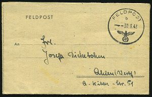 2966 | 14 € | II. WELTKRIEG: LUFTWAFFEN-EINHEITEN / LUFTFELDPOST 1939-45 : DEUTSCHES REICH 1942 (21.8.) 1K: FELDPOST/f/--- auf EF gez. Luftfeldpostmarke (Ju 52), rs. hs. Abs.: "Feldpost Nr.45 568" = Jagd-Geschwader 1 (Heer) Luft-Feldpost-Faltbf. mit Inhalt (Ostfront) n. Neudek/Karlsbad (Mi.1 A) | ![]() ![]() | |