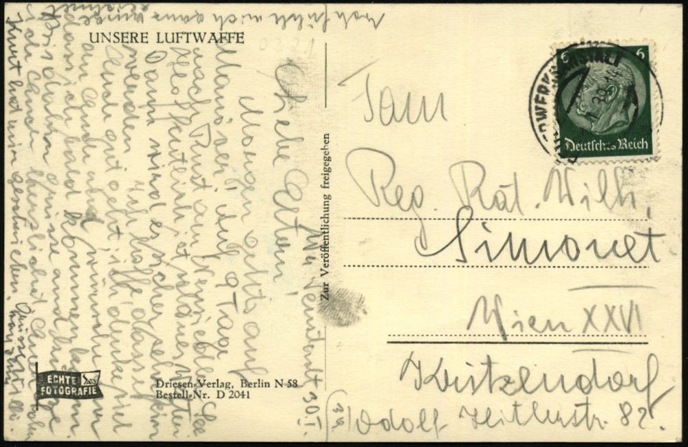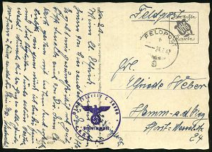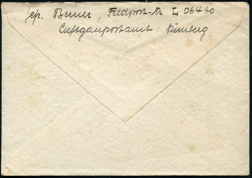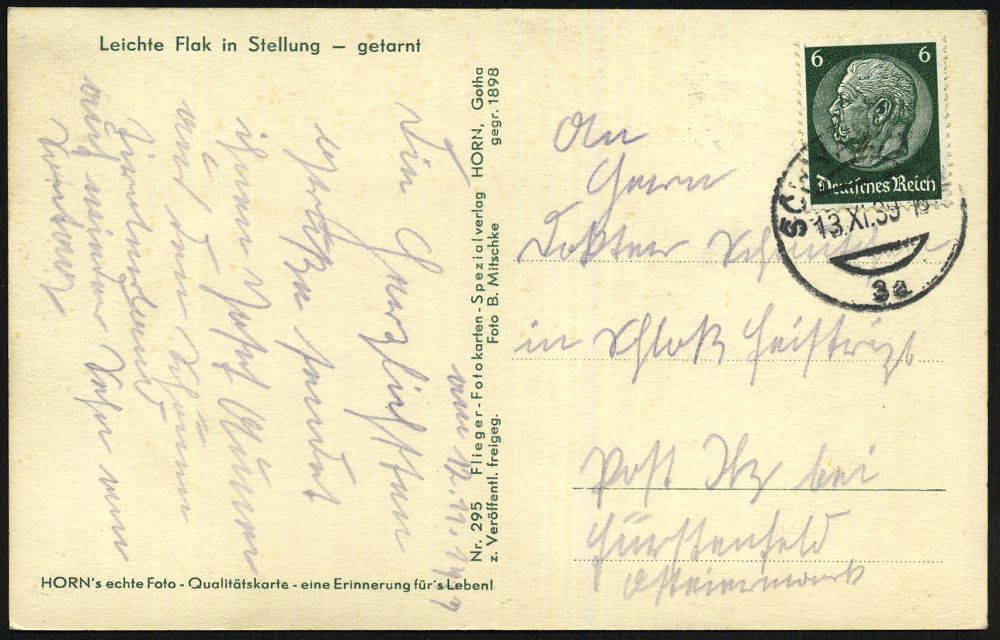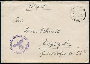 3038 | 10 € | LUFT- & BOMBENKRIEG / KINDER-EVAKUIERUNG (KLV) / FLAK-EINHEITEN (1939-45) : DEUTSCHES REICH 1941 (17.11.) stummer 2K-Steg = Tarnstempel (Hannover ?) + viol. 1K-HdN: Feldpost-Nr. L 42 630/ Luftgaupostamt Münster = 5. Battr. Res.-Flak Abt. 113 + rs. hs. Fp.-Nr., klar gest. Feldpost-Bf. + Inhalt n. Leipzig | ![]() | |