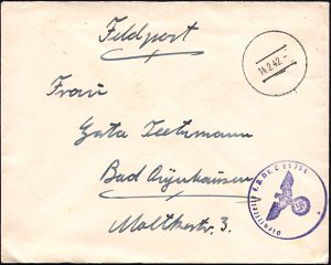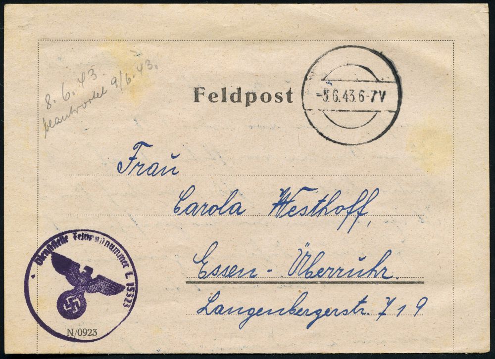 3043 | 10 € | LUFT- & BOMBENKRIEG / KINDER-EVAKUIERUNG (KLV) / FLAK-EINHEITEN (1939-45) : DEUTSCHES REICH 1943 (5.6.) stumme 1K-Brücke = Tarnstempel (Halle-Leuna ?) + schw.-viol. 1K-HdN: Feldpostnr. L 15323 = schwere Flak-Abt. 132 (LGPA Dresden), klar gest. Feldpost-Falt-Bf. mit Inhalt n. Essen | ![]() | |